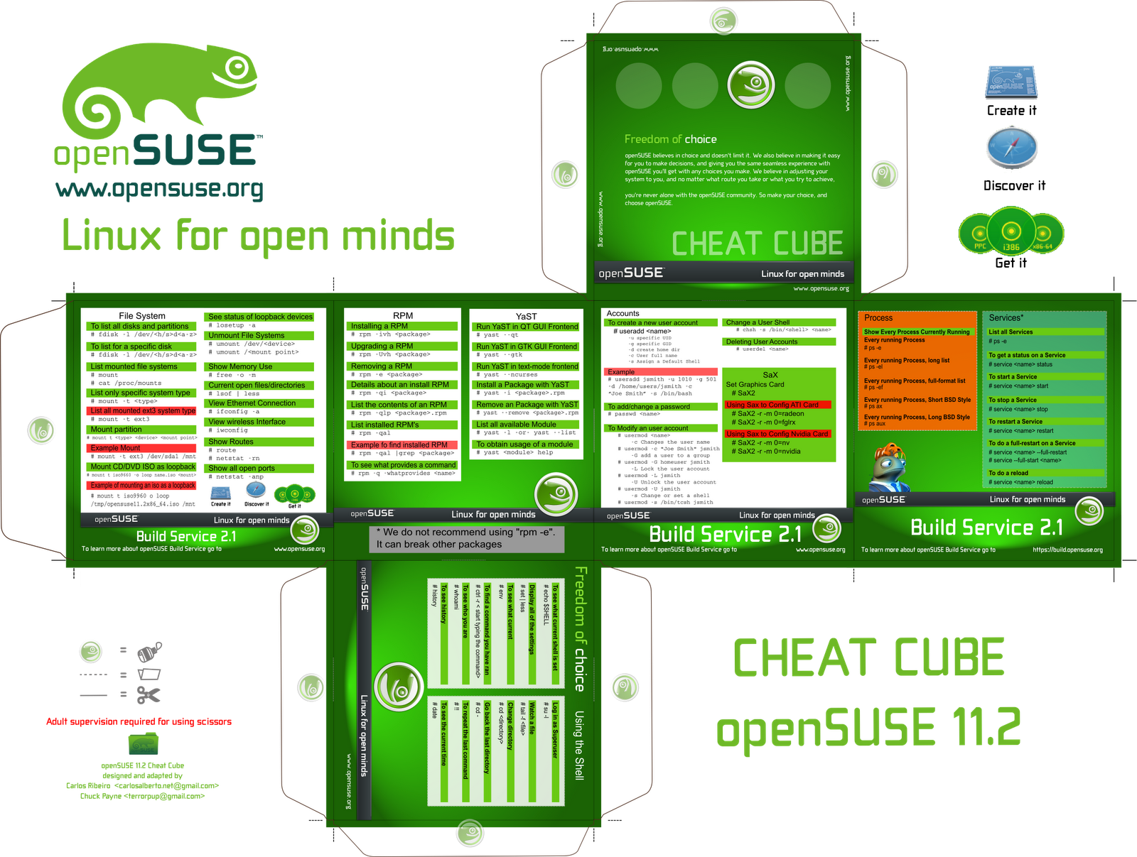 Recopilación de 4 cubos con los principales comandos de las 4 distros más usadas de GNU/Linux (Debian, OpenSuse, Fedora, Archlinux), están listas para imprimir, cortar y armar: